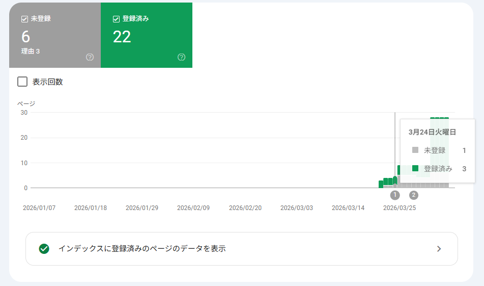 現在、32記事中22記事がインデックス登録済みです。申請を始める前と比べて、検索結果への反映スピードが明らかに変わっています。