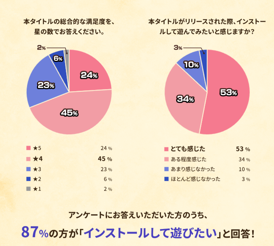 これを見るとCBT参加者の約87%が「正式リリース後も遊びたい」と回答しており、かなり評価が高いことがわかります。