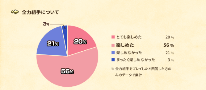 ゲーム内容についても同様に「面白い」という意見が多く、特にバトル面での評価が高かったです。バトル面で「楽しめた」と答えている方が「また遊びたい」と答えている方と同数程度になっているため、バトル面の評価が期待値に反映されているのかなと思いました。