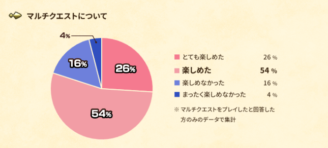 マルチクエストの評価も80%で若干下がり気味です。また、プレイした方のみの回答とのことなので、実際の評価はもう少し下がりそうですね。