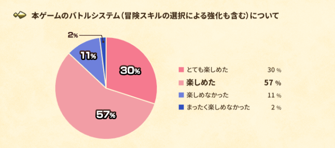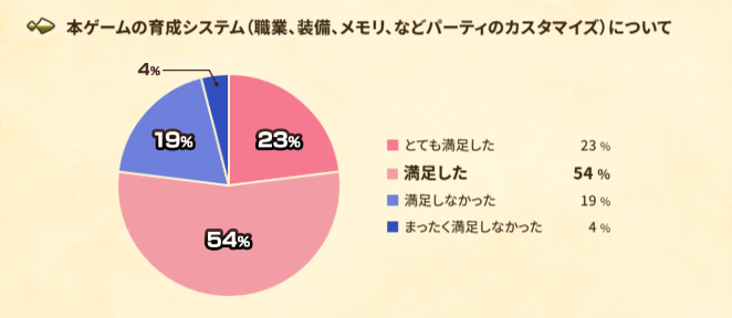 バトルシステムなどと比較すると10%ほど満足度が下がっていました。他のドラクエのソシャゲから持ち込んだ要素も多く、不満点もそのまま持ち込んでいる部分があったためかと個人的には思っています。