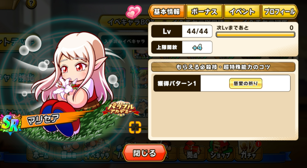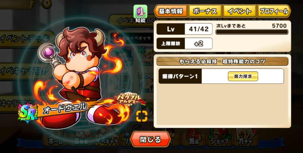 - 評価: 魔力探求が非常に優秀。知能のSRキャラは3体いるためこの順位。知能キャラでは「アオイ」に次ぐ2番目の評価の高さ。パワフルアカデミーのサクセス内にある教本に必要な能力が下がるのも最大の強み。SRではこのガチャの3体のみ。