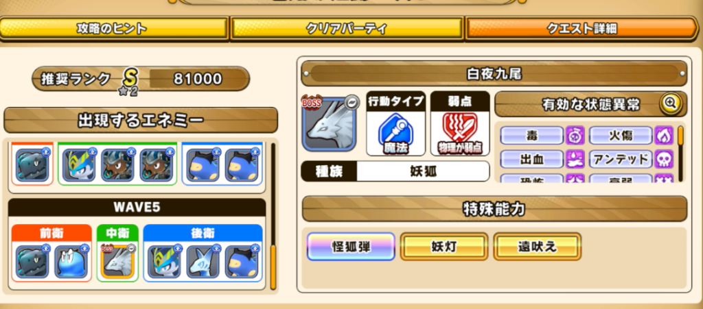 攻略対象である「白夜九尾」は物理が弱点ですが、ヌメリンは物理が全く通らないため、魔闘士を2~3は入れて道中とボス戦で時間がかからないようにしましょう。