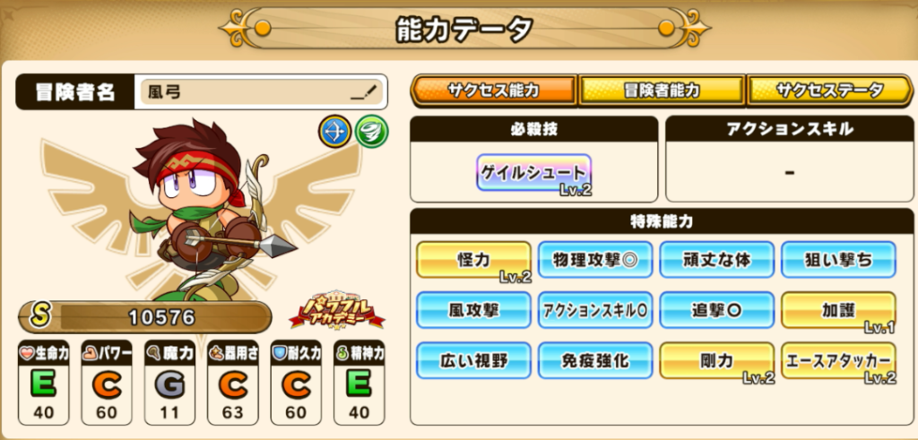 | 中衛・後衛火力 | パワー60(C)以上 魔力60(C)以上 器用さ60(C)以上 | ゲイルショットor平常心 (ミヤビから取得) 火力系特能 | 耐久は「上級のススメ」をクリア後数値を整えるだけの耐久まであればOK。 |