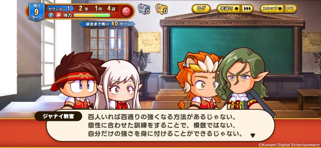 セクション1 2年2月1週(残り8ターン) 教本開始 ジャナイ教官より教本の説明あり、その内容