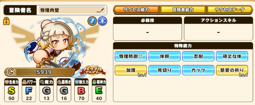 総合力は低いですが、壁性能は非常に高いものとなっていて前衛で重宝しています。