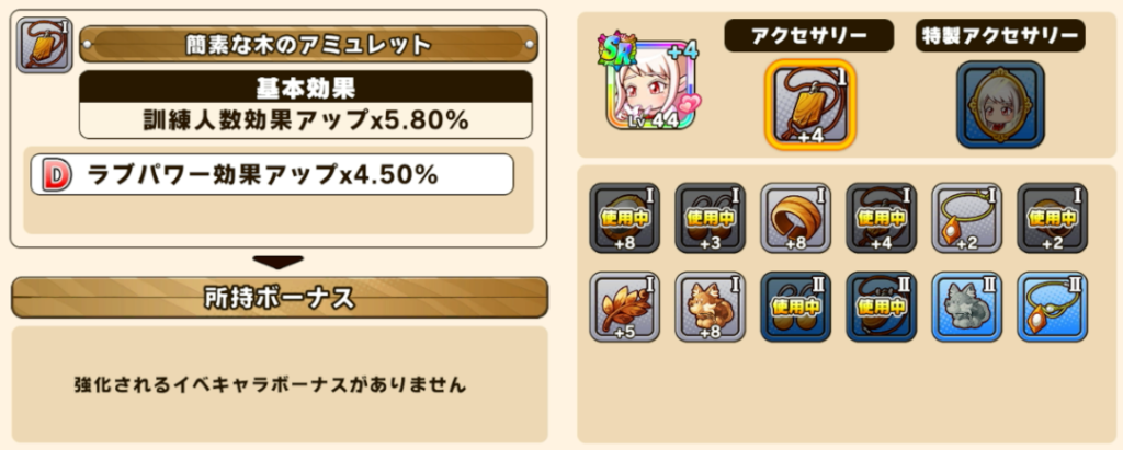 アクセサリーは派遣やミッション・ガチャの報酬などで貰えます。画像のように「強化されるイベキャラボーナスがありません」と表記されている装備をすると効果が発揮されないため、必ず確認するようにしましょう。