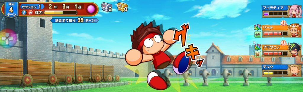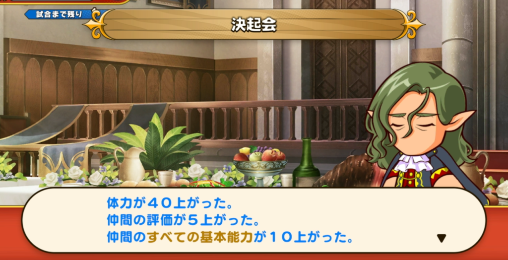 試合はオート進行・能力依存のため、試合前には必ず能力を上げて活躍しやすくしましょう。また、決起会に参加することで仲間のステータスが上昇し選手権に勝ちやすくなるため、11月3週or4週で遊びを選択することも忘れないようにしておきましょう。