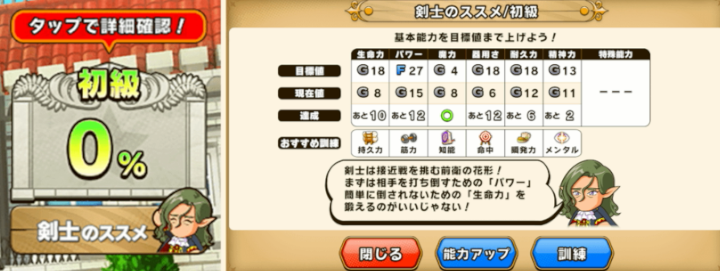 | 初級 | 生命18 / パワー27 / 魔力4 / 器用18 / 耐久18 / 精神13 | 筋力+40 / 敏捷+25 / 技術+25 / 仲間パワー+5 / 物理攻撃コツ(少し) / スラッシュコツ(かなり) |