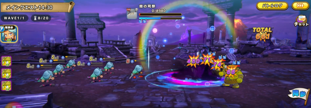 NG②:魔法使いの火力を後回しにする 暗闇ゾーン(5〜7ターン)はミスが多発する運ゲーパートです。その前に2,040ダメージ近くを稼いでいないと、8ターン目に必殺2500程を撃っても総計が8,980に届きません。